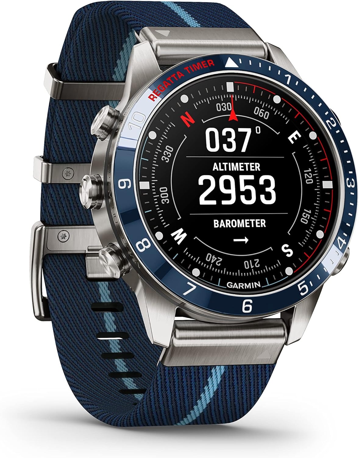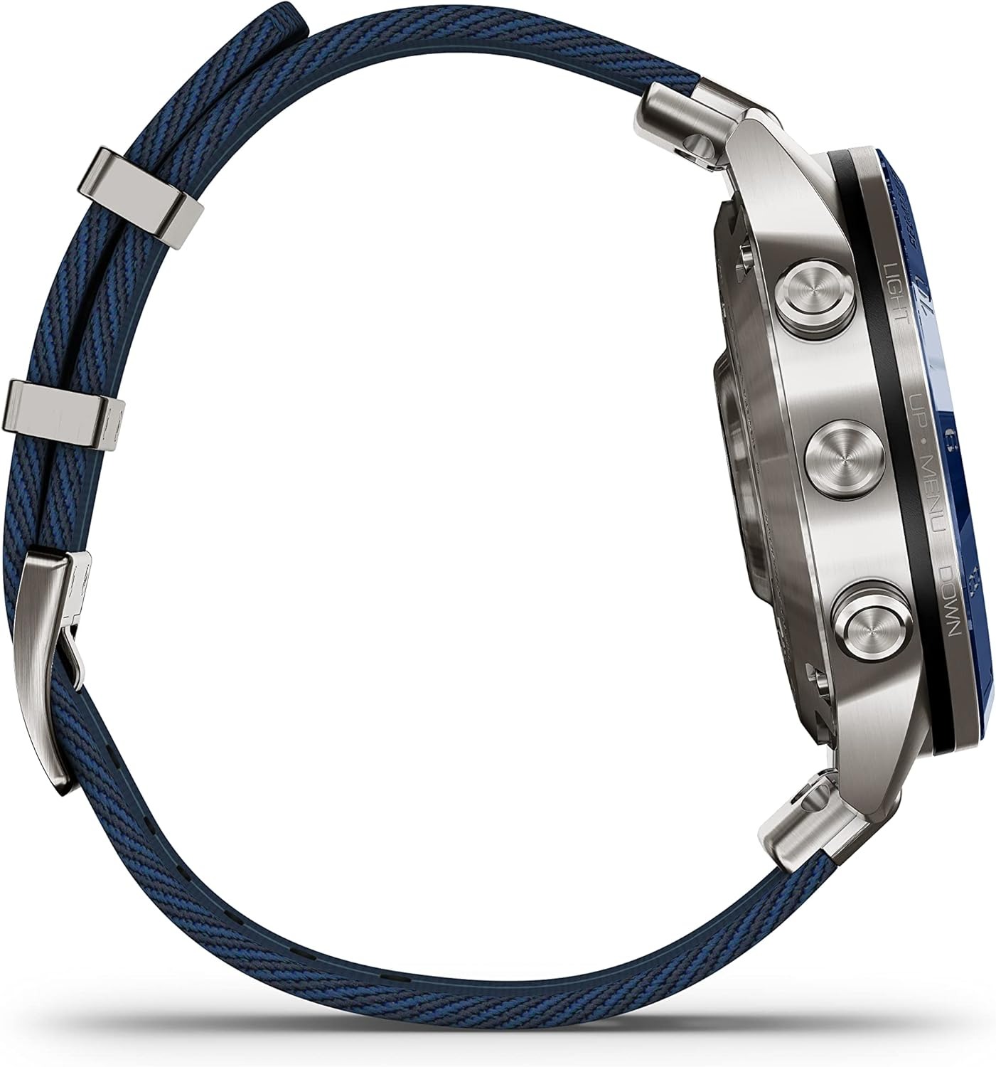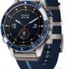Built for living life at the helm, this luxury modern tool watch features a race-inspired striped jacquard-weave nylon strap and a stunning AMOLED touchscreen display with traditional button controls. The 46 mm case is made of Grade-5 titanium for an ultradurable design.