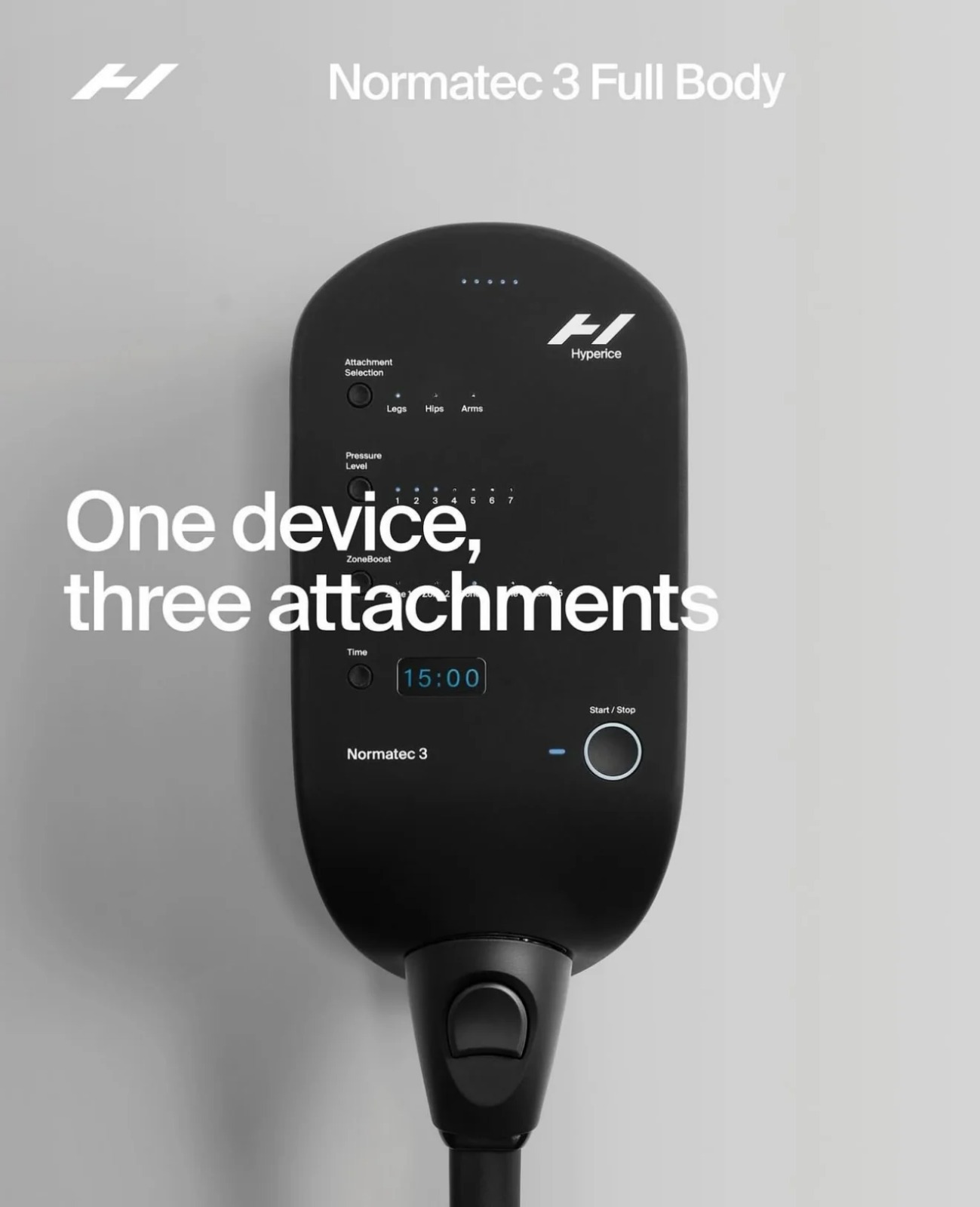 Normatec 3 Full Body includes the Normatec 3 control unit, leg attachments (pair), hip attachment, and arm attachments (pair).