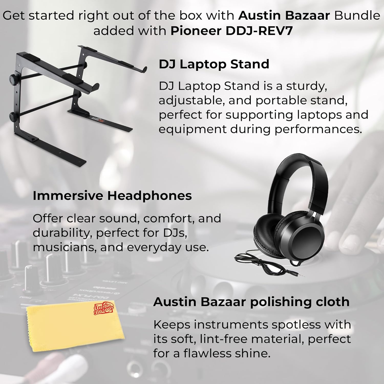 - EVERYTHING IN ONE BOX: Bundle includes Stand, Headphones, and Austin Bazaar Polishing Cloth
